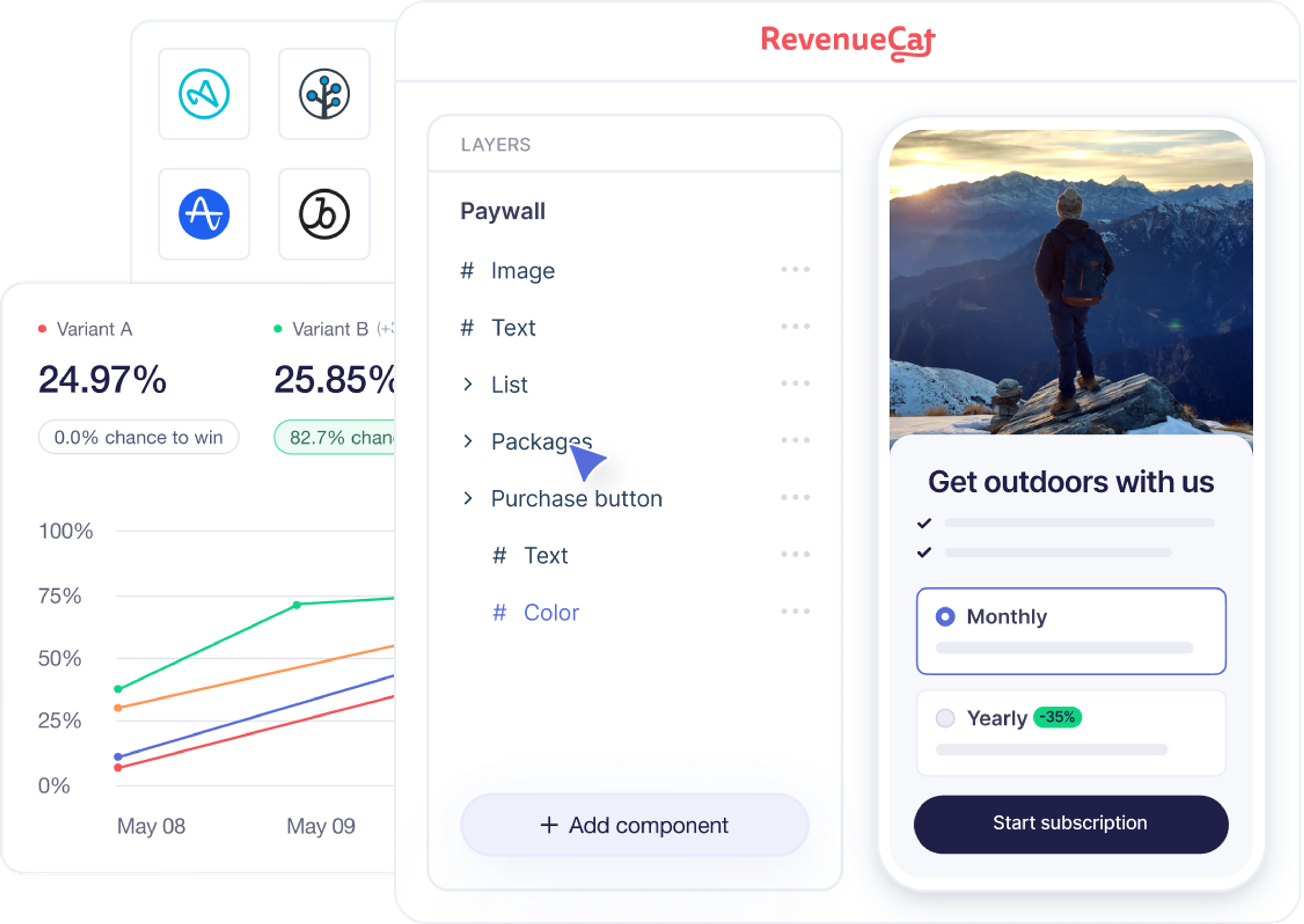 Create, test, and compare multiple paywall versions with built-in experiments to find what converts best — all without app updates.